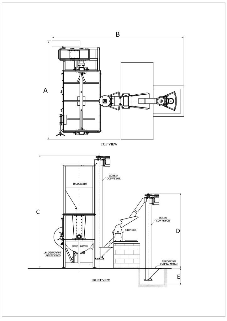 This plant has been designed for farmers and feed mill owners who are having low height of their existing feed mill and want to get more output. This plant can be installed in height of 15 ft. of feed mill for 1000 kgs/batch mixer.